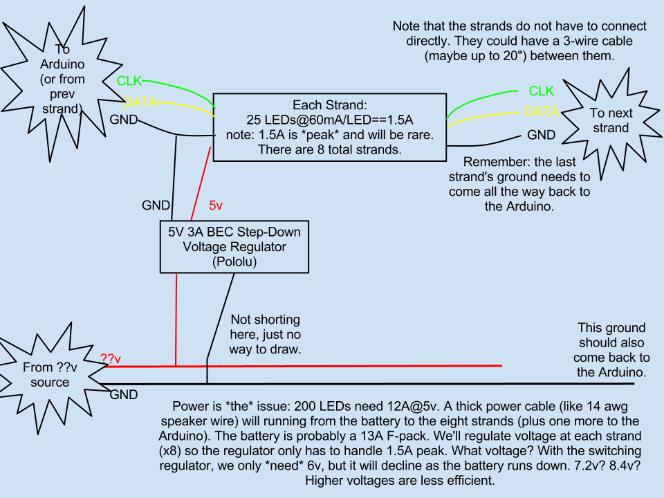 [footnote 1: Note for measurement: as you’re figuring out where each strand starts relative to the power bus, keep in mind that you have 20-24″ of additional run. This comes from the connections that result from the tails on the mini-tamiyas, the regulator itself, and the tails on the connectors between the regulator and the strand. Detail: the mini-tamiya has a 6″ tail; with 2″ lost on each end, that’s at least 8″ added to the run between bus and regulator. The regulator itself has 7cm leads on one end, is about 5cm, then has a 15cm lead on the other end. To the regulator output, we’ll solder a power connector, and a power connector to the leads from the strand, adding 2×6″. We can trim all these substantially if the strand starts closer to the bus]