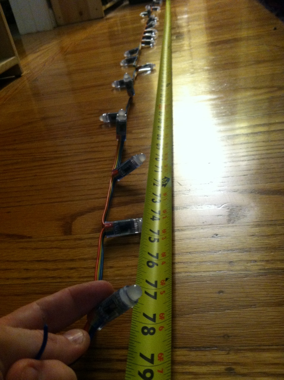 The strands are 78″ stretched out. The LEDs are bigger than I expected, nearly the thickness of my index finger. Of course, 12mm, I should have realized.