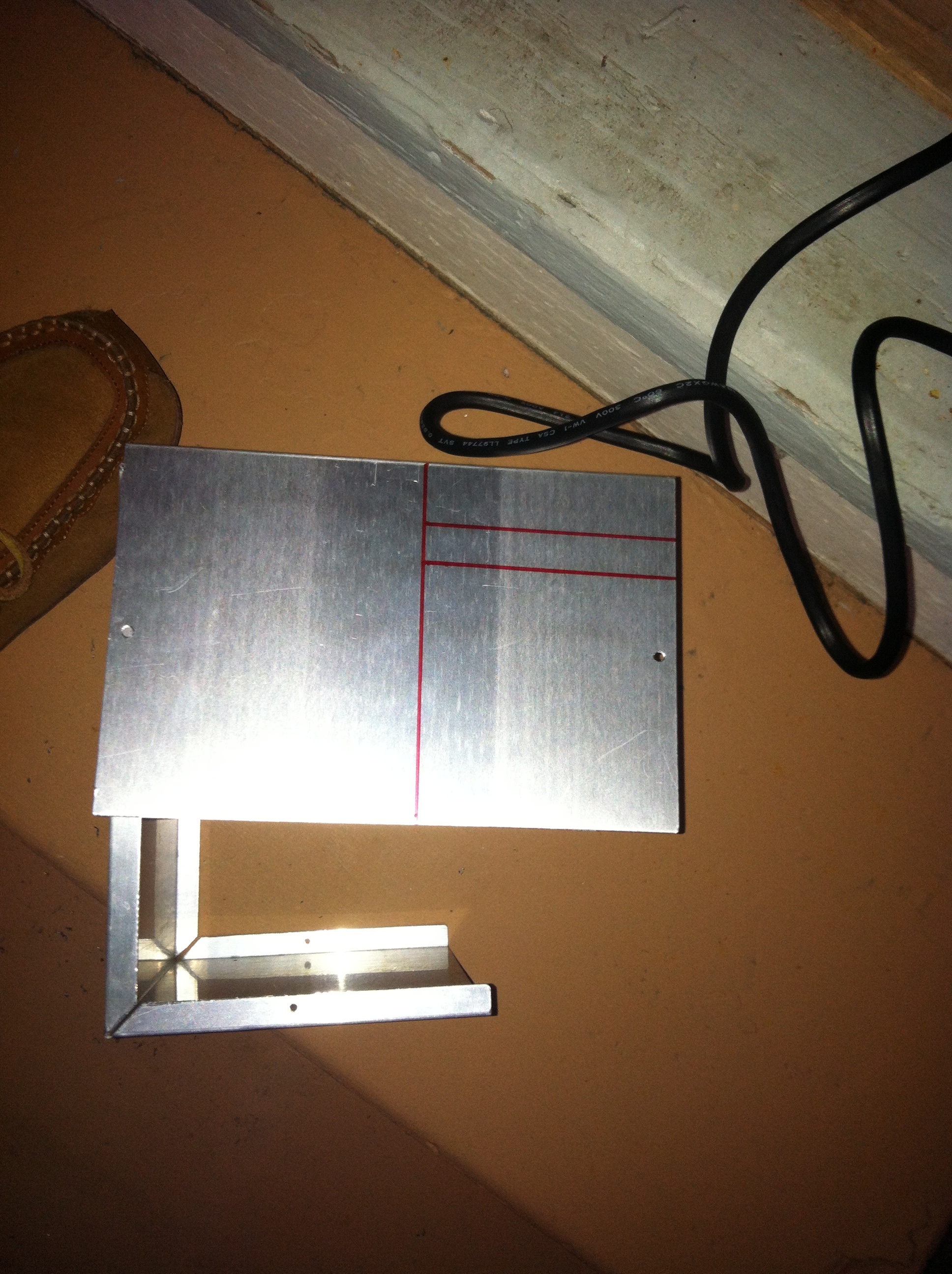 Using a Dremel, I cut an aluminum plate from an enclosure I had. This is the plate on which the binding posts, LEDs, and switch will be mounted.