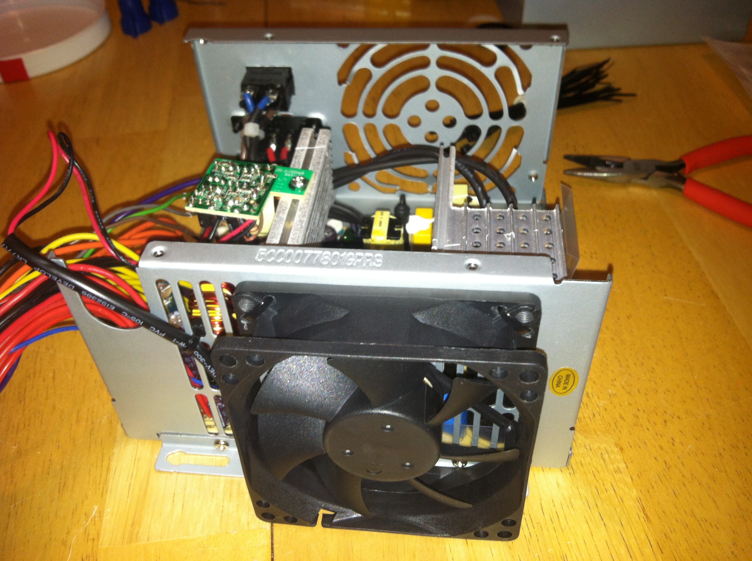 ATX power supplies need a load or they won’t turn on, and the standard hack is to put a 10 ohm/10w resistor between a 5v (red) line and ground. I did it inline, and hot-glued it to the chassis wall.