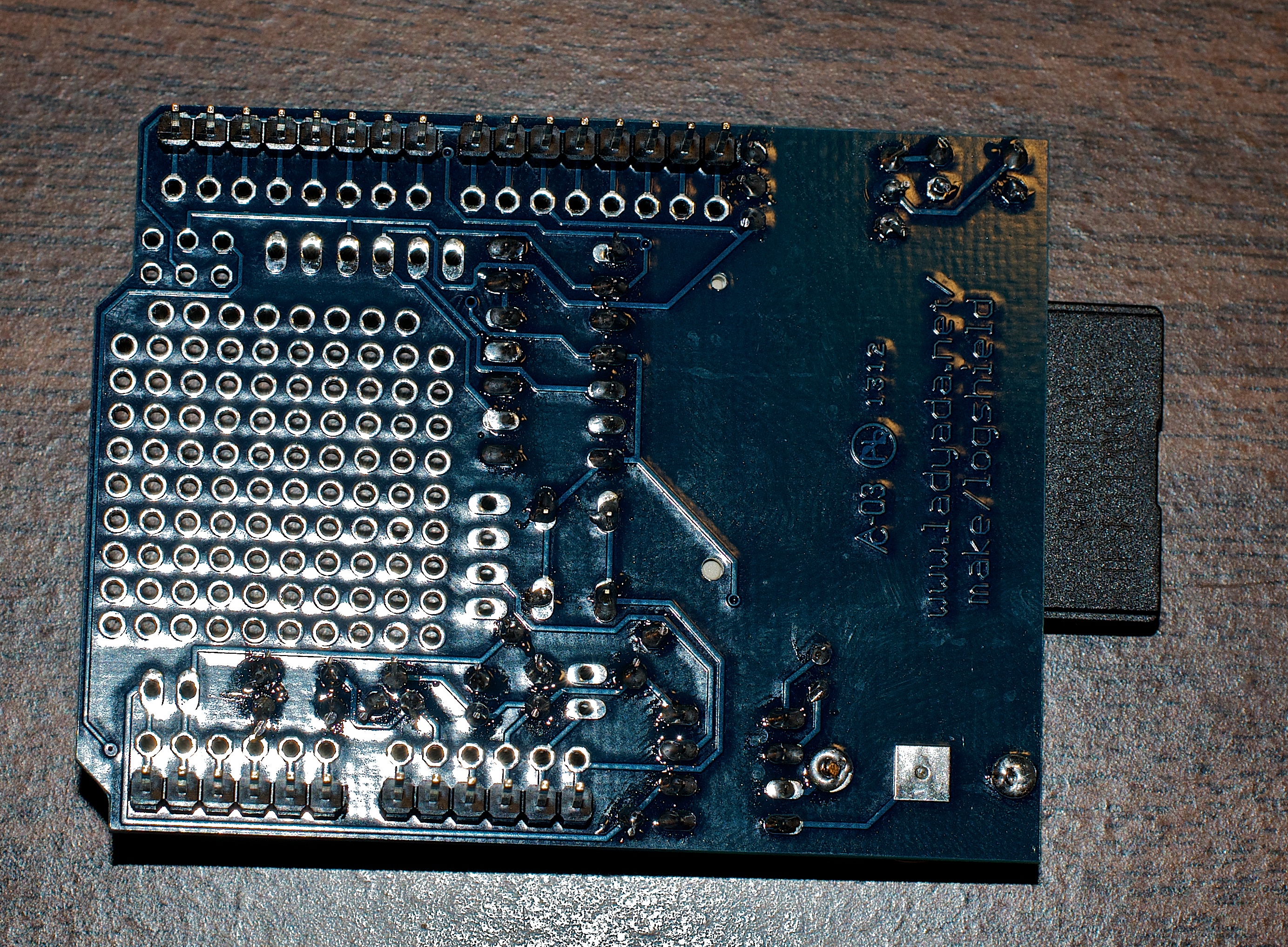 On the data logging shield, the real time clock (RTC) worked immediately, but the SD card gives an ominous message (“Initializing SD card…initialization failed.”). On the Adafruit forums, the main culprit seems to be crappy soldering. Totally likely, so here are photos: