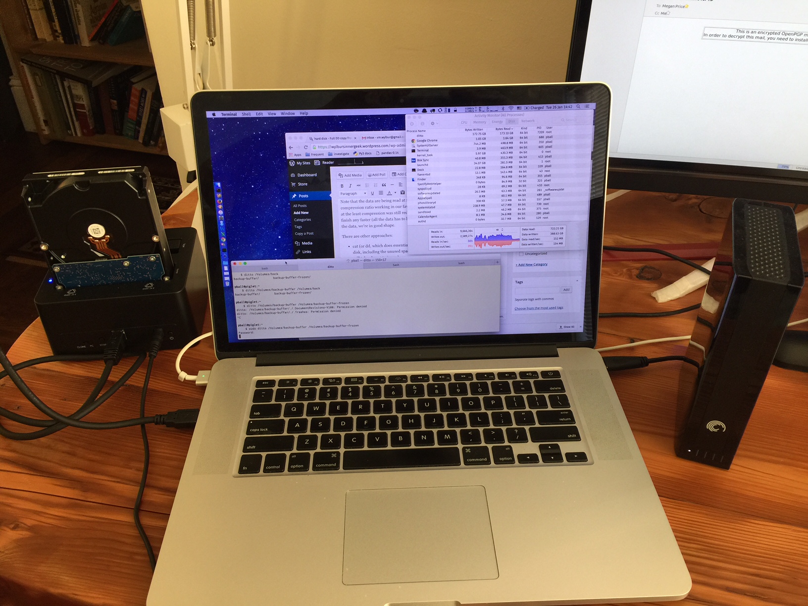 Migrating to a new machine means a lot of file copying. In particular, I’ve got a Seagate 3TB, usb3 external disk I really like. I want to use the Seagate and its fancy housing with the new setup, but first I should archive it to another disk to be put away in case I want to dig it out someday (unlikely, but whatever).