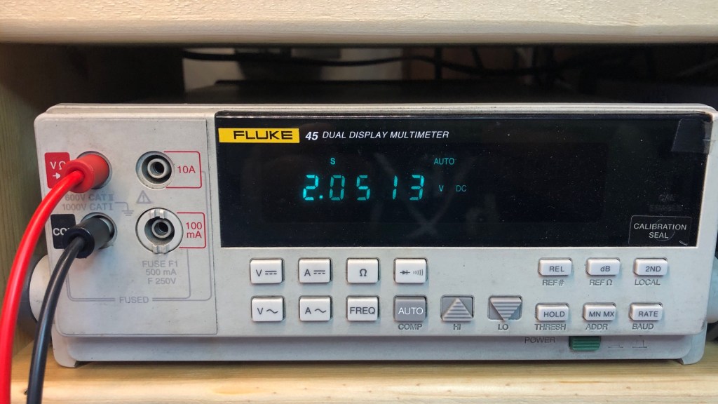 I’ve connected the reference to all threefour of my measurement devices. First I have an ancient but wonderful Fluke 45 multimeter which claims precision to a tenth of a millivolt at the medium reading speed at 3v, or 0.02% (I can’t quite tell from their table). It has a calibration seal dated in December, 2000.