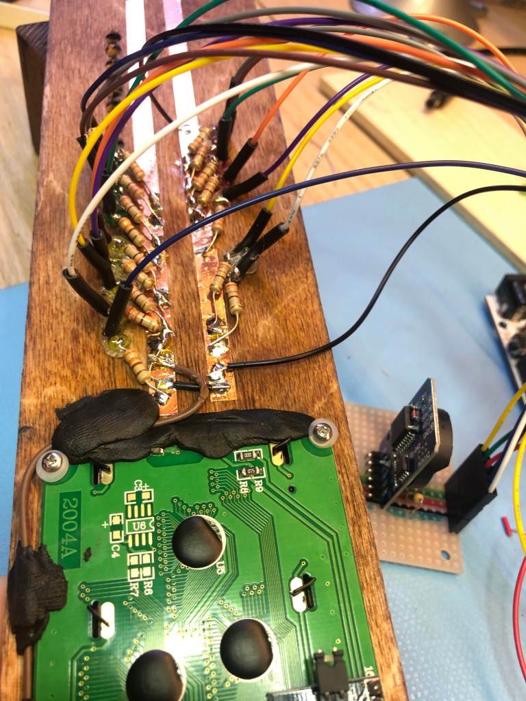 Of course I need a clock. I used a cheap DS3232RT with this library. We’re going to need to introspect a little bit, so I added a somewhat clunky but entirely functional 20×4 LCD screen that speaks I2c. And I added a giant, blinking arcade button.