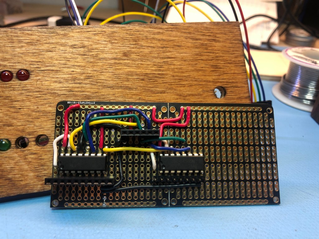To build this, I need a way to take the 3 signals from the Arduino to the 3 chips. After a lot of prototyping, I wired the chips together with a header for the Arduino (in the middle of the wires) and with headers for the LEDs (below the chips) together on this great strip board. This photo is when two of the chips are soldered, waiting for the third.