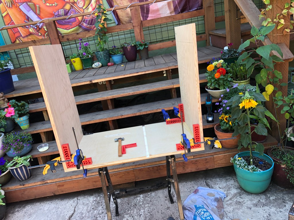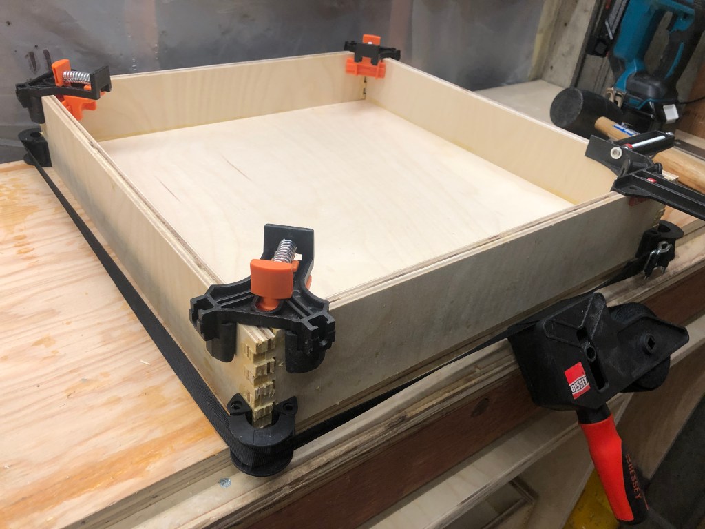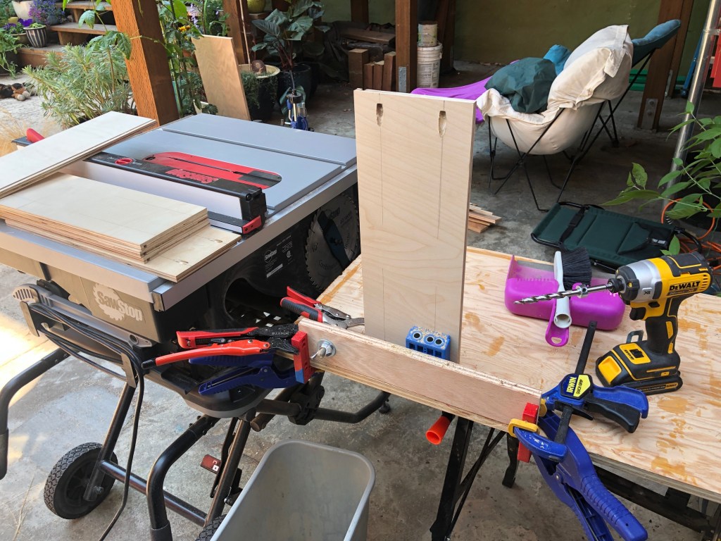 I built two drawers held together by pocket screws around the bottom (everything in the photo is 1/2" ply). I think these are strong, but I don’t like the Kreg pocket hole system. The drill guide itself was fine, but the ratcheting clamp system that is supposed to hold the guide against the wood constantly slipped. It was never tight, not once, so I created my own vise system. It worked, but it was a PITA.
