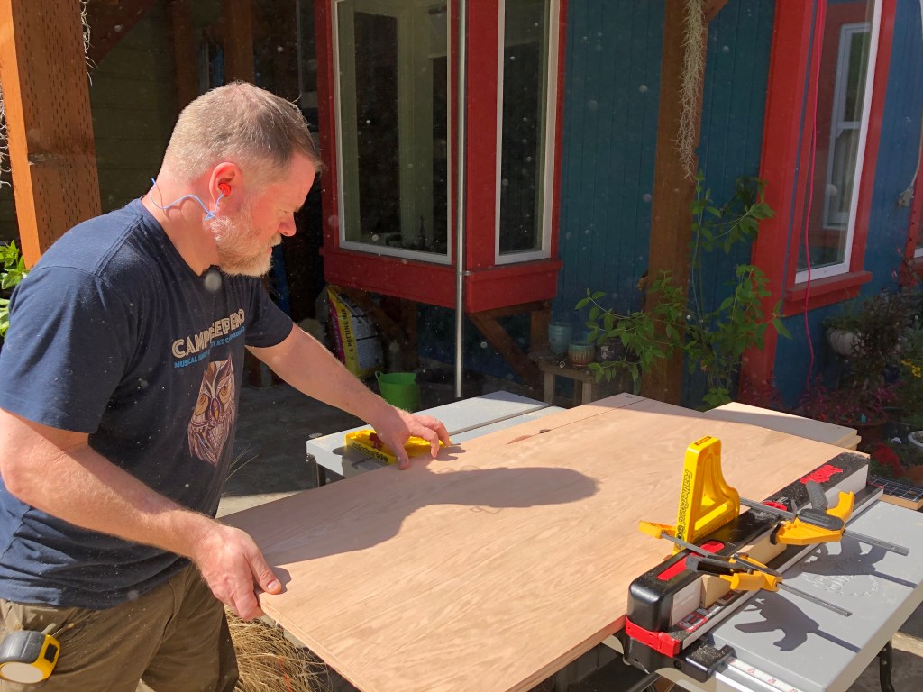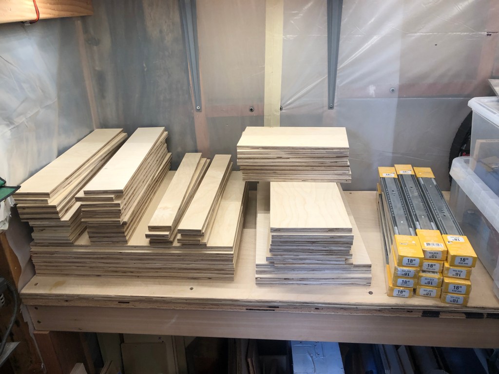 After much drawing, I decided to build 7 drawers in the left column, each xx"W x 3 1/4"T, and 4 drawers in the right column each xx"W x 6 1/2"T. I figured I’d just make butt joints, so the measurements were pretty easy. However, the plywood comes in 4×8′ sheets, and I only have a Toyota Camry sedan. I tried to estimate all the pre-cuts so that I could cut the plywood into useful sizes that would fit into the car at the lumber yard. Needless to say, this was extremely wasteful. I cut a lot of pieces to the wrong size and lost wood, but even more, I lost a lot of time trying to figure it out. Lesson learned #1: have MacBeath Hardwood deliver the full sheets, and only cut them once the final cuts are set.