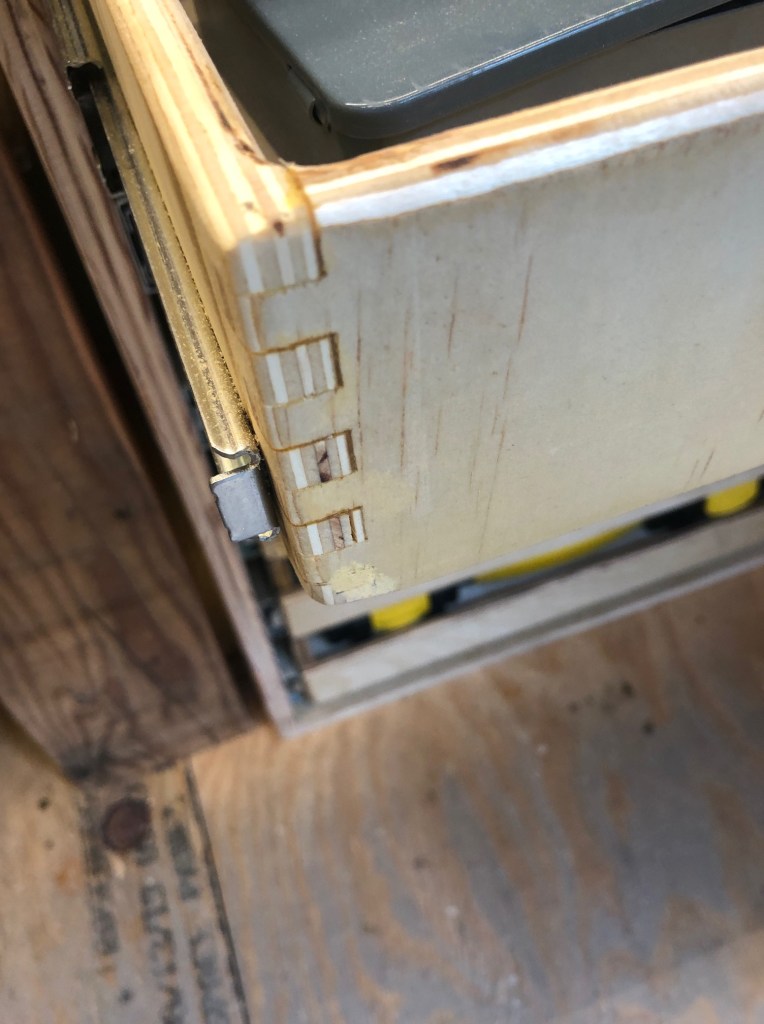 To build the carcase, I just used butt joints. My theory is that the primary weight is on the drawers which will tend to pull the sides and divider down and together. They’re 3/4" plywood, and there’s a 1/4" ply back panel providing rigidity. Everything is glued, pinned, and then screwed through the butt joints. (Ignore the pocket holes which were a screwup. It’s not nearly as rigid as I’d like, it’s got a little bit of flex around the middle axis (imagine that if you’re looking down at it, it can rotate slightly). Some reinforcement might be needed someday.
