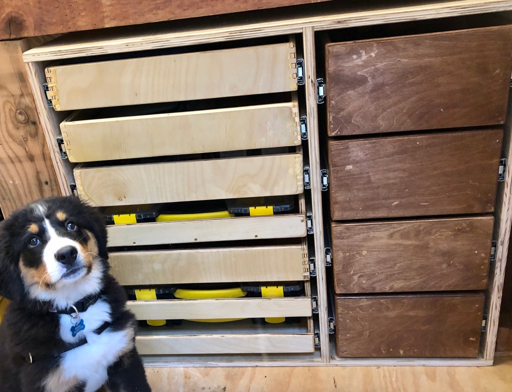 So if there’s a saw, there needs to be a lot of cutting. That’s my theory, anyway, now that I have a fancy new saw. My lab + shop are together 95 square feet, so space is seriously tight. There’s a space 31"T x 33"W x 22"D that could hold more if there were an orderly way to put stuff there. This is new for me, I’ve never built drawers before. Here’s the space with a cabinet frame and a 11-week-old, 14-lbs puppy for perspective.
